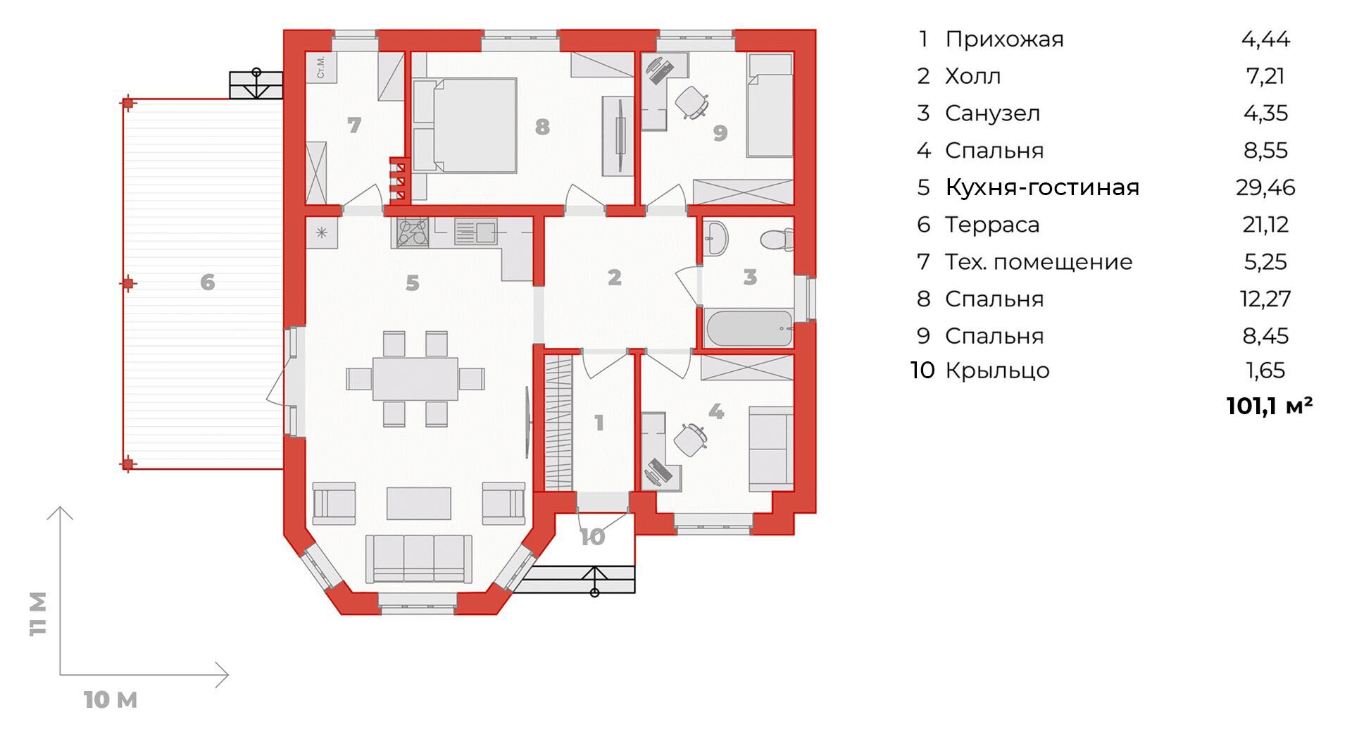 Строгий, но в то же время элегантный проект, выполненный в классическом архитектурном решении. Идеально подойдет небольшой семье с двумя детьми.