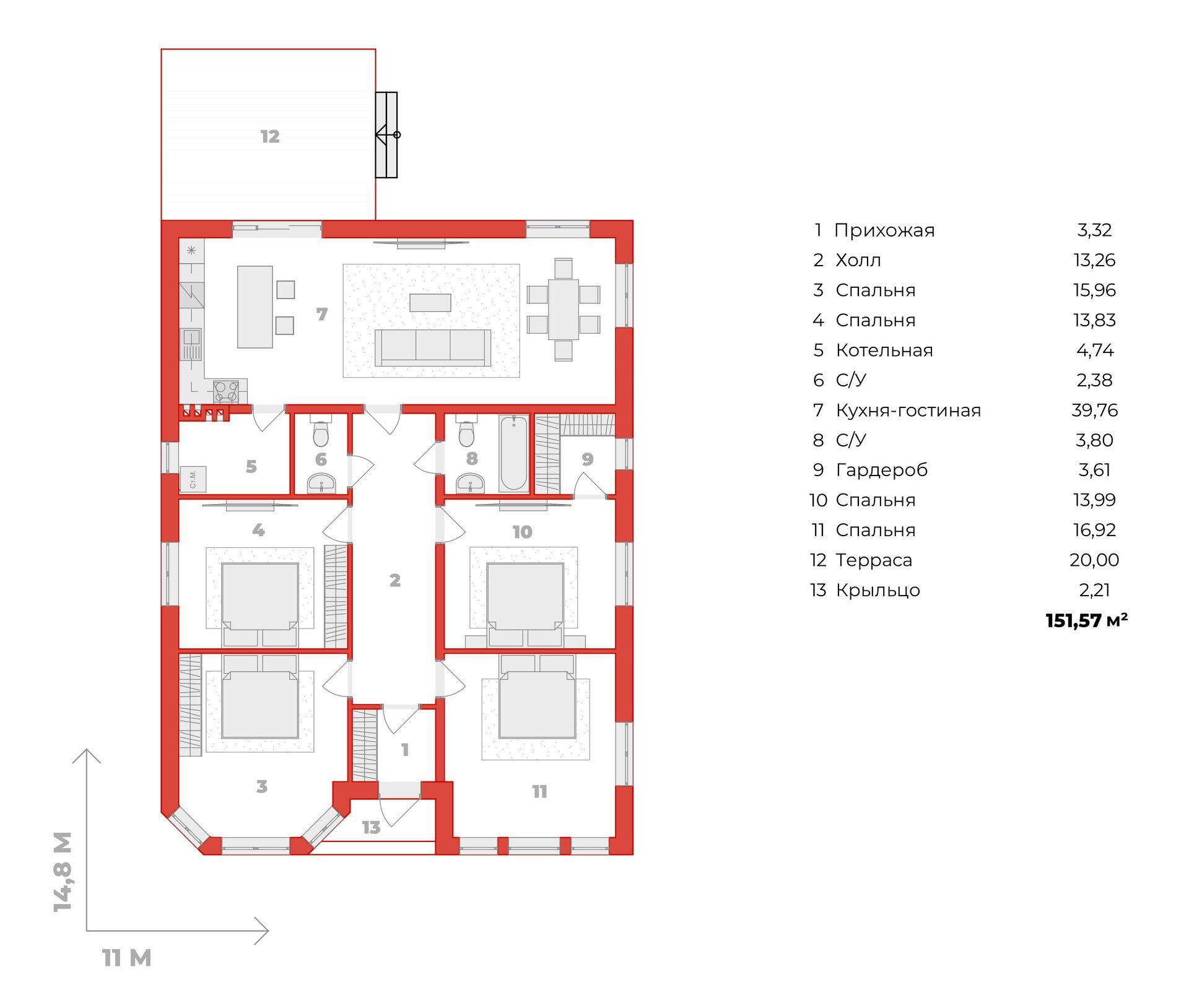 * Площадь жилого дома определяется в соответствии с приказом Росреестра от 23 октября 2020 г. № П/0393. Сумма площадей всех комнат, включая площади помещений вспомогательного использования, балконов, лоджий, террас и веранд. Площадь крыльца и тамбура в общую площадь не включаются.