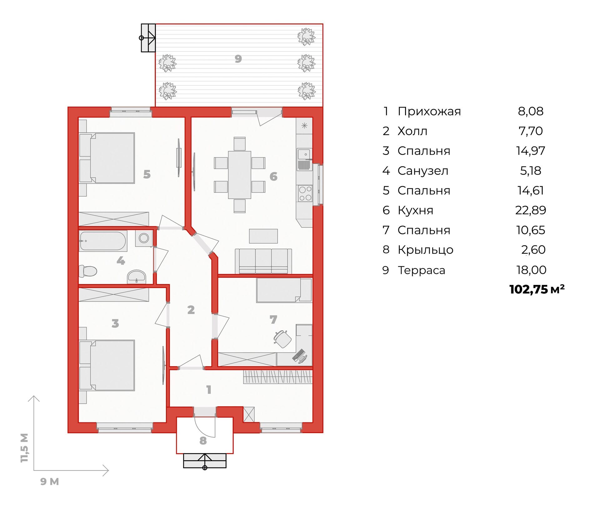 * Площадь жилого дома определяется в соответствии с приказом Росреестра от 23 октября 2020 г. № П/0393. Сумма площадей всех комнат, включая площади помещений вспомогательного использования, балконов, лоджий, террас и веранд. Площадь крыльца и тамбура в общую площадь не включаются.